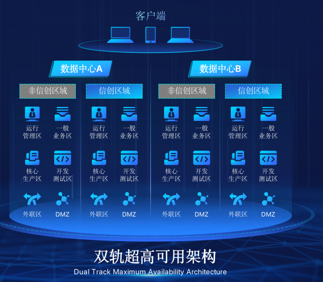 英国上市公司365在企业面临自主创新IT基础重构过程中,推出的全新架构双轨超高可用架构(简称DTMAA),在双活数据中心的分区调度基础上,添加每个数据中心内信创域和非信创域的分域调度,来实现分区分域协同的多活双轨超高可用。
